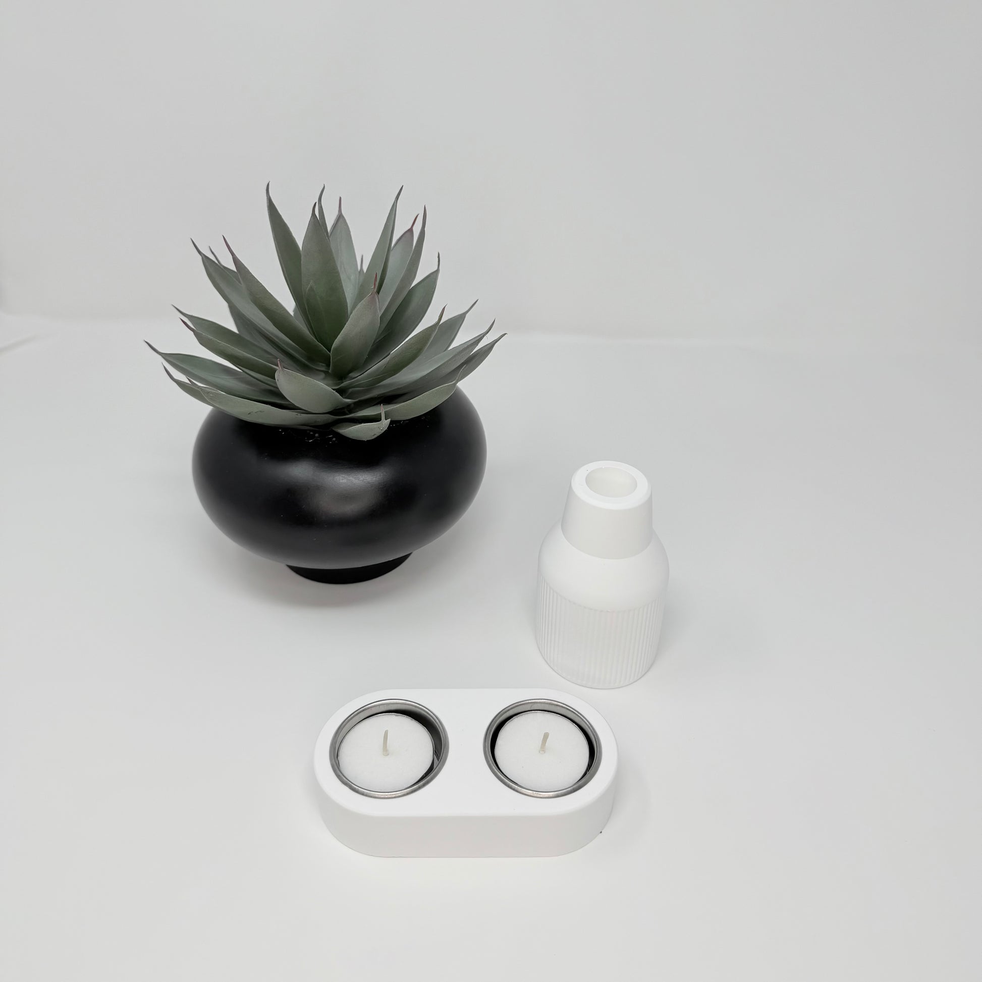 Smooth oval modular design that holds one, two, or three tealights depending on the selected configuration.